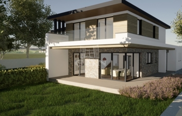 Modern, földszint + emeletes ikerház Porotherm N+F falazattal, monolit vasbeton födémmel és sávalapozással épül.
