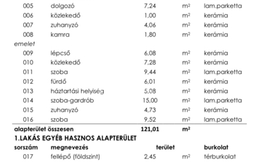 Az 1. számú lakás nettó 121 m² alapterületű, kétszintes elrendezésű.