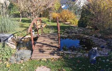 gyümölcs cserjék, kb 8 m3-es halastó híddal, gyümölcs bokrok,