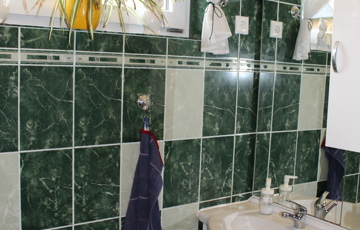 zuhanyzós fürdőszoba 4,5 m2, külön WC 0,8 m2, közlekedő 5,7 m2,