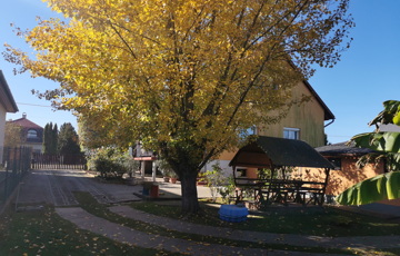 Udvar: előkertben rózsabokrok, 6 személyes kisméretű pavilon, 2 db nagyméretű tuja, 3 db banánfa,