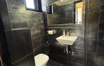 A földszinti fürdőszoba 2024-ben teljes körű felújításon esett át, új burkolatokkal és szaniterekkel.