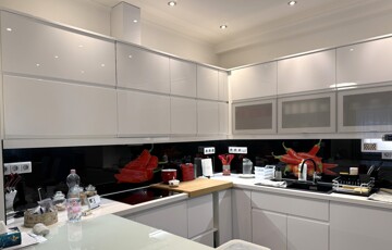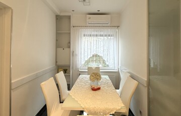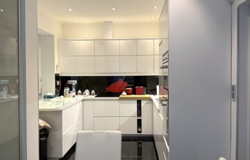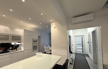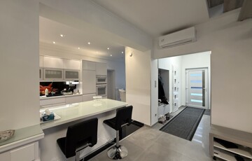 • an elegant, large kitchen area connected to the living space with a breakfast/dining bar, fitted with large built-in kitchen cabinetry and appliances; windowed dining area (17,4 sqm) with a walk-in wardrobe/closet,