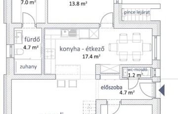 • központi közlekedőből nyíló 1 szoba (8,2 nm 1.90m feletti alapterülettel) plusz 2 félszoba (kb. 6-6 nm 1,90m feletti alapterülettel) tetőtéri ablakokkal, utóbbiak akár dolgozó szobaként,