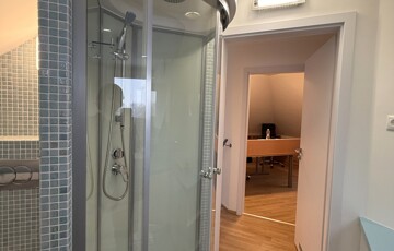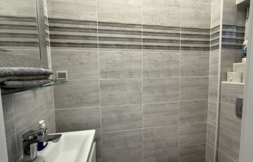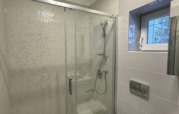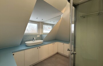 • elegáns természetes fénnyel megvilágított fürdőszoba zuhanyzóval és wc-vel, mosdó szekrényekkel,