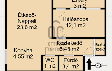 - felosztása: konyha, étkező-nappali, 1 hálószoba, amely erkélykapcsolatos, közlekedő, beépített szekrény, fürdő, külön WC, tároló
