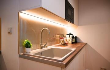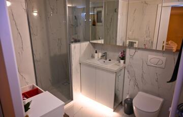 Nyitott terű, jól felszerelt konyha, zuhanyzós fürdőszoba és külön WC is rendelkezésre áll.