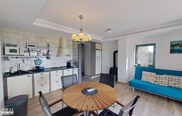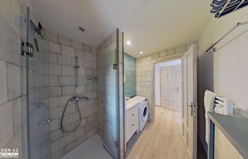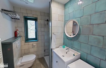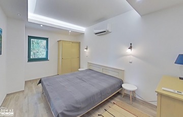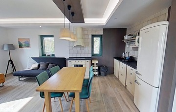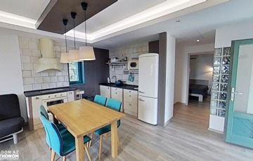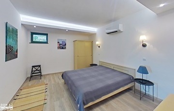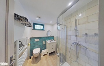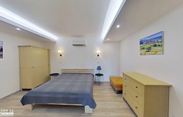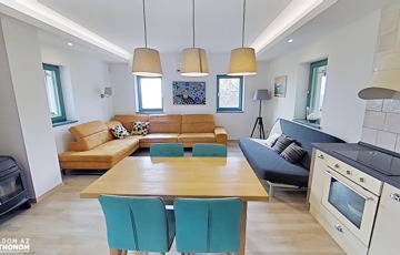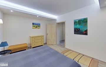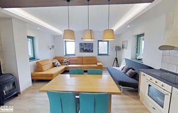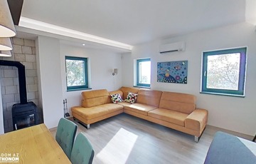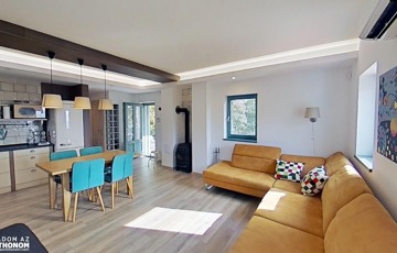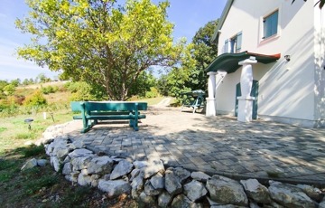 A szigetelt ház tégla építésű, szintenként 55 m2-es, a két szinten két egymástól független, önálló bejáratú apartmannal rendelkezik, mely teljes mértékben bútorozott és gépesített (konyha-nappali-háló, zuhanyzós fürdőszoba), továbbá 10 m2-es emeleti, és 100 m2-es panorámaterasz került kialakításra a földszinten. Parkolás térkövezett saját parkolóban lehetséges 3 gépjármű számára.