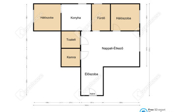 -A lakás része (átalakítható) két hálószoba, egy nagy 16 nm-es nappali étkezővel, széles előszoba, zuhanyzóval szerelt ablakos fürdőszoba, külön helyiségben lévő nagy méretű toalett, és egy bepolcozott kamra kapott helyet a konyha mellett.