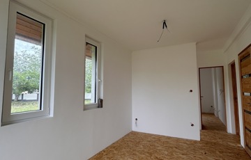 - Fal rétegrend: 12 mm-es OSB, 15 cm vastag táblás közetgyapot szigetelés, hőtükörfólia, tűzálló gipszkarton, vizes helyiségekben pedig impregnált gipszkarton.