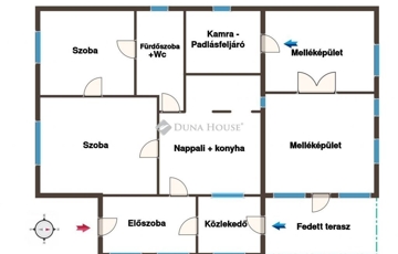 Az ingatlanban egy konyhás nappaliszoba, két különnyíló, tágas szoba, egy fürdőszoba +wc, előszoba, és kamra helyiségek találhatóak. Az épület mögött, az utcaáról nem belátható, fedett terasz kapott helyet. A házhoz 44m2-es melléképület csatlakozik, melynek irányában a ház bővítésére is könnyű lehetősgé nyílik. Elrendezése okán családosok, nagyobb térigényűek, párok számára is ideális választás.