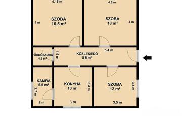 3 szoba, étkezős konyha, kamra, zuhanyzós fürdőszoba + wc, közlekedő.