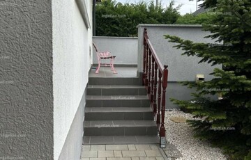 A bejárat egy 9,2m² teraszról nyílik,2 db melléképület található az ingatlan két oldalán,melyek közül a kisebbikben kézmosó és WC került kiépítésre. A nagyobb melléképület inkább tárolóként funkcionál. A ház déli -keleti és nyugati oldalakról nagy méretű redőnyös szúnyoghálós Aereco szellőztető rendszeres ablakokkal biztosítja a kellemes világos tereket. Riasztó berendezés, kaputelefon, szellőztető és öntöző rendszer teszik még komfortosabbá. Az ingatlan két oldalán könnyen karbantartható gondozott parkosított kert található,a környék csendes barátságos,a főváros 15 perc alatt elérhető kényelmesen.