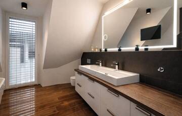 3 hálószoba (ebből egy gardróbos, egy panorámás erkéllyel), fürdőszoba káddal és zuhanyzóval, közlekedő beépített szekrényekkel