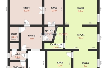 nappali 19,9m2, konyha 13,1m2, fürdőszoba-wc 3,9m2, szoba 12,1m2, előtér 12m2;