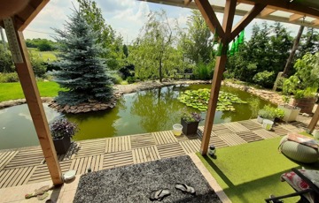 Kert: Örökzöld sövény, díszfák és egy hangulatos kerti tó díszhalakkal.