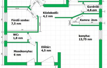 Az elosztás praktikus: Amerikai konyhás nappali, három hálószoba, külön fürdő és WC, mosókonyha, gardróbszoba és kamra.