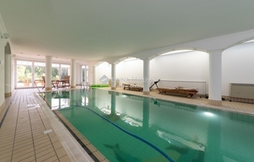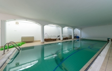 Egy szinttel még lejjebb a kert szinten wellness részleg: fűtött vízforgatós, ellenáramoltatóval felszerelt 10mx4m medence (alatta gépház szint), öltöző, tároló és fürdőszoba, teljes szélességében eltolható üvegajtókkal megnyitva a hangulatos, napos, szépen gondozott, magas tujákkal körbevett kertre. A ház teraszosan a hegyoldalra simuló beton oldala, dupla szigetelést kapott.