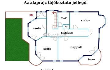 Az utca szinten levő előkertből nyíló földszinten található a bejárat, közlekedő,