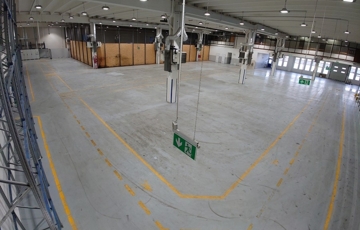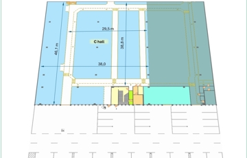 A csarnok területe 1 685,4 m2, melyből 276,7 m2 berendezett magaspolcos raktár, 181,1 m2 fejépületi csarnokrész, 23,8 m2 szociális helyiség.