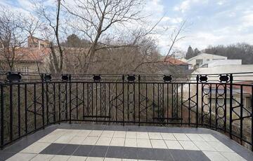A nappaliból nyílik az 5 m²-es erkély, ahonnan a belső udvar zöld, fákkal sűrűn benőtt, szinte erdőszerű látványa tárul elénk, amely a városi környezetben ritka nyugalmat biztosít. A látvány inkább parkos, természetközeli érzetet kelt, mintsem klasszikus belső udvarét.
