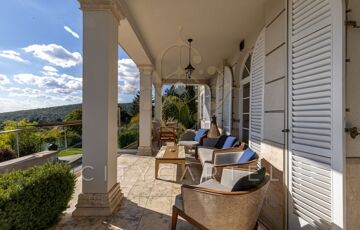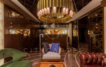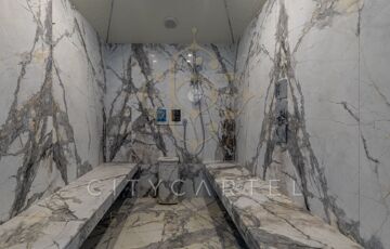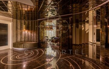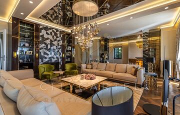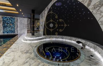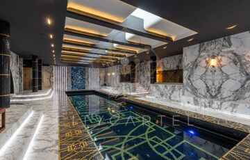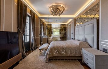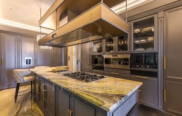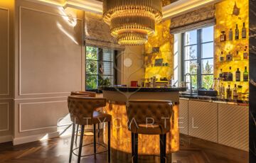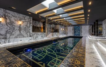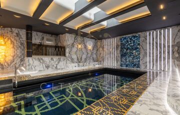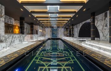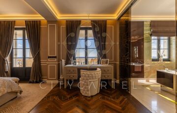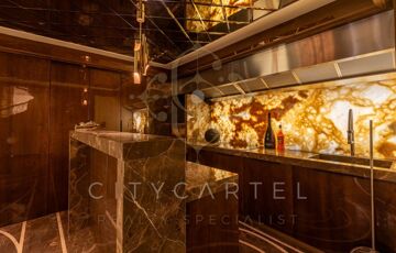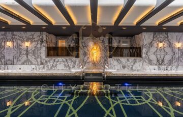 A villa minden részlete egy mestermű: a márvány, az ónix és a nemesfa harmóniája tökéletesen kiegészíti a modern technológiai megoldásokat. A reprezentatív, magas belmagasságú terekben a térérzet és a fény játéka uralkodik.