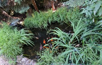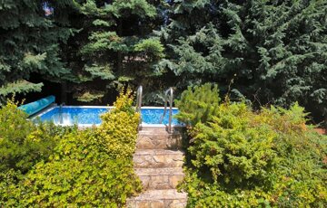 Intim, szeparált kert örökzöldekkel, kerti tóval és medencével