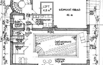 * Kertszint 143,4 m2: uszoda(74,8 m2), dupla garázs(41 m2), lift (4,8 m2), szauna(2,75), zuhany(2,18), WC (1,64), kamra(4,2), háztartási helyiség(8,35), közlekedő(3,5), kertkapcsolat; belmagasság: 2.70 m