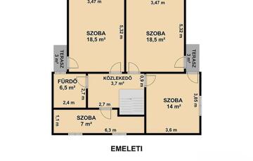 Emelet: 4 szoba, fürdőszoba + mellékhelyiség, közlekedő, 2 erkély.