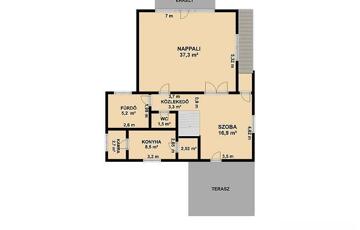 Földszint: Nappali, étkező, konyha, spejz, fürdőszoba, mellékhelyiség, közlekedő.