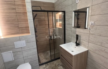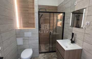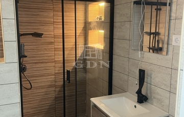 Fürdőszoba: mosdószekrény, törülközőszárító, modern zuhanykabin elhúzható ajtóval