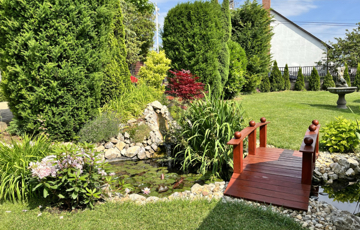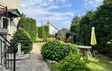 A ház egy 1421 m²-es, parkosított dupla telken helyezkedik el, amely két utcáról is megközelíthető, többállásos parkolóval. A telket gondozott növényzet, óriás hibiszkuszok, hortenziák, fenyők, valamint egy kerti pavilon, sütögető és koi pontyokkal, tavirózsákkal díszített kerti tó teszi különlegessé. Az automata öntözőrendszer és a robotfűnyírók gondoskodnak a folyamatos harmóniáról.