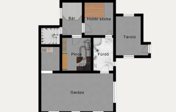 • Pinceszint: garázs, tároló, fürdőszoba, hobbi szoba, szauna, bár/borozó