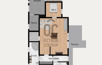 • Földszint: 45 m²-es nappali teraszkapcsolattal, étkező, konyha, hálószoba, fürdőszoba, garázs, tároló