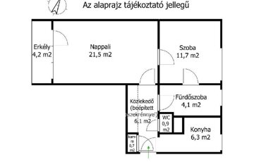 A lakás jelenlegi kialakítása nappali és hálószoba elrendezésű, amely praktikus és jól élhető tereket biztosít. A nappali nyugati tájolásának köszönhetően a lakótér a délutáni és esti órákban kellemes természetes fényt kap. A belmagasság 2,7 m, ami tovább növeli a térérzetet.