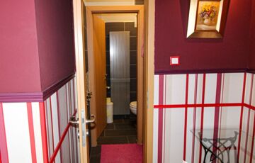 Előszoba, étkező, konyha és kamra, zuhany és WC, valamint a nappali.