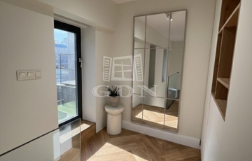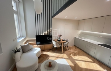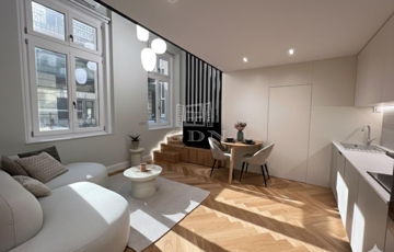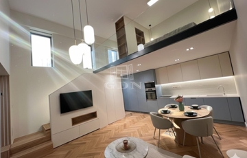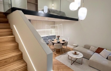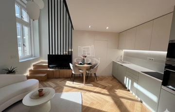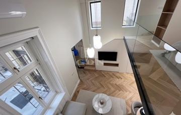 Ez a 104 m²-es, belső két szintes, galériás lakás a 13 m²-es teraszával /eredetileg Lichthof/ egyedülálló lehetőséget kínál a belvárosi élet és a csendes udvari elhelyezkedés kombinációját keresőknek.