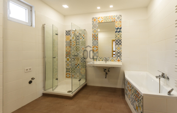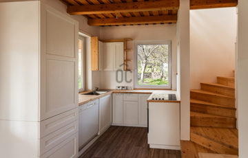 A földszinten tágas nappali–konyha kialakítás, egy hálószoba, valamint egy korszerű gépészeti helyiség található. A modern fürdőszoba káddal, zuhanyzóval és mellékhelyiséggel felszerelt.