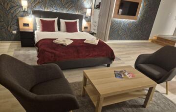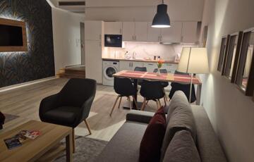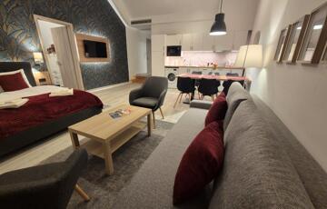 A lakás teljesen berendezett, vadonatúj bútorokkal és teljesen felszerelt konyhával. A fényképeken látható valamennyi berendezési tárgy a bérlemény részét képezi, így többek között az étkezőasztal, a székek, az ágyak, a kinyitható kanapé, a szekrények, valamint minden egyéb bútor és berendezés is a lakás tartozéka, ezért a lakás azonnal költözhető és teljes értékűen használható.