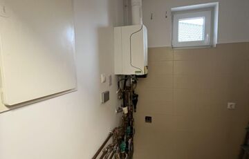 A fűtésről gázkazán gondoskodik padló és radiátoros hőleadással. A melegvizet szintén a gázkazán állítja elő.