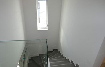 Belső térben, a lépcső mellett modern üvegkorlát világítással.