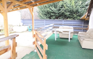Az épület mögött, a lakótérhez kapcsolódó, hatalmas, mintegy 100m2-es terasz kapott helyet, mely délnyugati tájolásának köszönhetően a nap nagy részében kellemes, világos, ugyanakkor árnyékolása is megoldott. Az épületre ebben az irányban napelemek is fel vannak szerelve.
