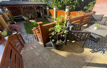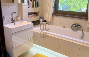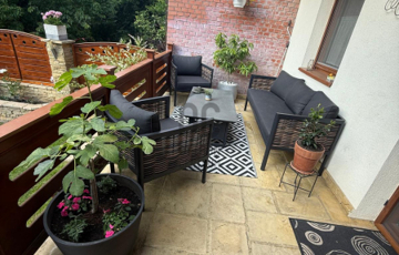 A nappali - étkezőből közvetlen kijárat nyílik a tágas teraszra, amely kellemes, nyugodt kapcsolatot teremt a gondozott kerttel.