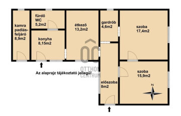 - Helyiségek: 2 szoba, konyha, étkező, előszoba, gardrób, kamra, fürdőszoba-WC.