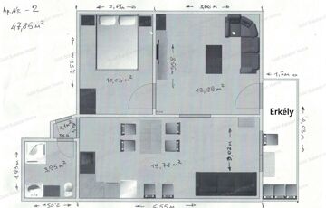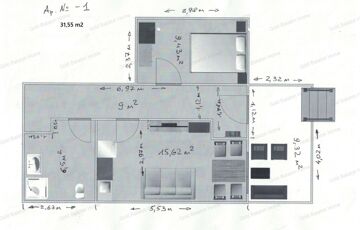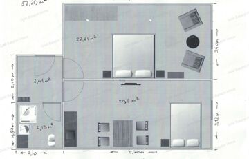 - apartman 3 (2 fő részére): 1 hálószoba, nappali-konyha-étkező, fürdőszoba zuhanyzóval+WC