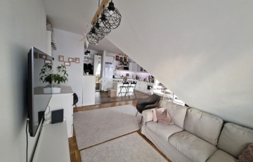 Tetőtéri elhelyezkedés egész nap világos, napfényes terek, a kialakítás miatt a térérzet a tulajdoni lapon szereplő méretnél nagyobb