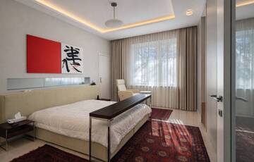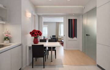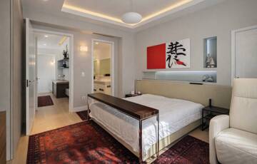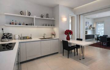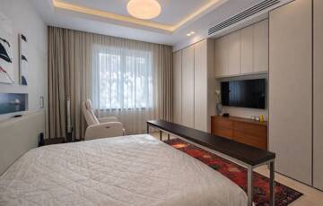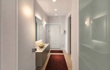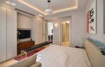 A lakás kiváló arányú, tágas terekkel rendelkezik, magas belmagassággal és mennyezetig épített tárolórendszerekkel.