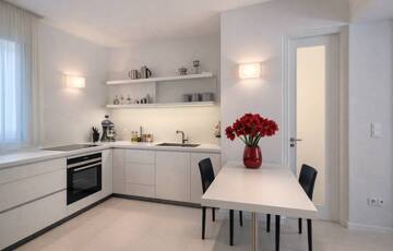 A napfény végigsimít a magasfényű felületeken, a tér pedig egyszerre letisztult, elegáns és megnyugtató – pontosan az az érzés, ami miatt ezt a lakást látni kell.