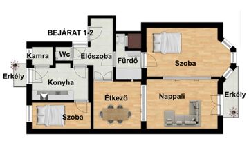 -84nm-es lakás(konyha, nappali, 2 lakószoba, fürdőszoba, előszoba, különálló wc és egy kamra)