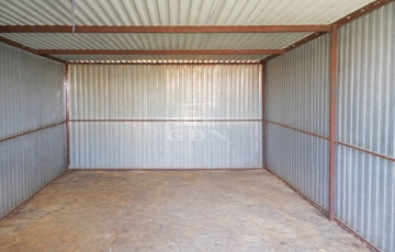 A kertben egy kis faház és egy bádog tároló is helyet kapott, amelyek további tárolási lehetőséget biztosítanak.